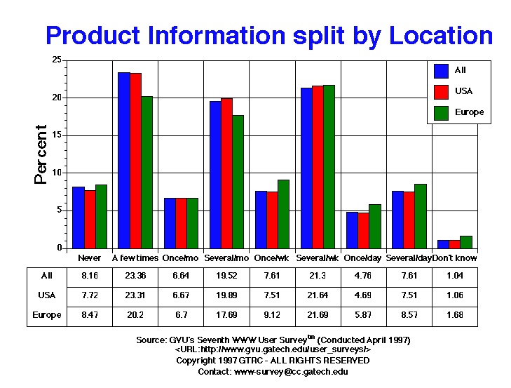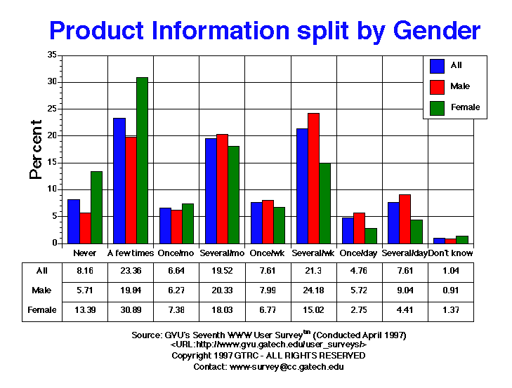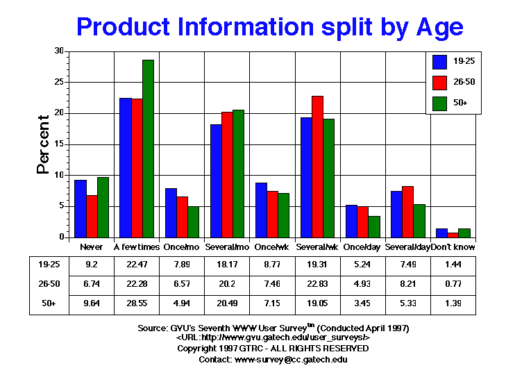 - Product information remains one of the most popular types of information accessed. A surprisingly small proportion of users have never accessed product information on the Web (8.16 Seventh vs. 7.83% Sixth), while 12.37% access product information on a daily basis. 26.16% (30.1% Sixth) access it on a weekly basis and 28.91% (25.89% Sixth) on a monthly basis. This is roughly the same distribution as found in the Fifth Survey indicating the steadfast utility of the Web for production information gathering. Males access product information more regularly than females do: 32.17% of males access it on a weekly basis compared to only 21.79%% of females-a finding consistent with the Sixth Survey. Only 5.71% of the male respondents claim to have never accessed product information on the Web compared to 13.71% of the female respondents. There are still no clear trends for use of product information with respect to age, although there are noticeable differences in many of the frequency categories.