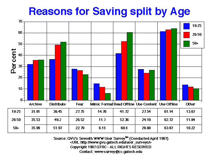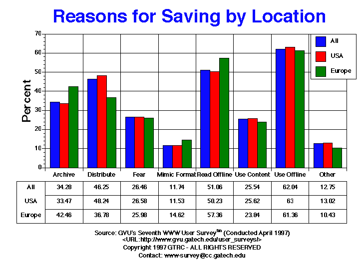 - For this question, users could mark more than one answer. As found in the Sixth Survey, by far the most widely cited reason for save and printing documents is to use them off line (62.04% Seventh vs. 62.32% Sixth). Not surprising given the poor resolution of current monitors, 51.06% (52.57% Sixth) store/print documents to read offline. There seems to be a far amount of sharing of the online world with those without access, as 46.25% (49.28% Sixth) distribute the documents to others not online. This ranking and percentages are nearly identical to the Sixth and Fifth Surveys. Nearly a third report saving/printing Web pages for archival purposes (34.28%) and out of fear that the content will disappear (26.46%).