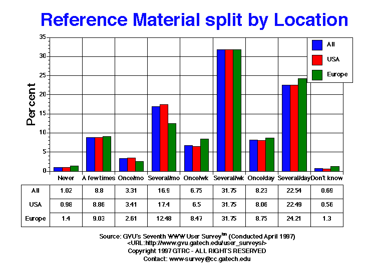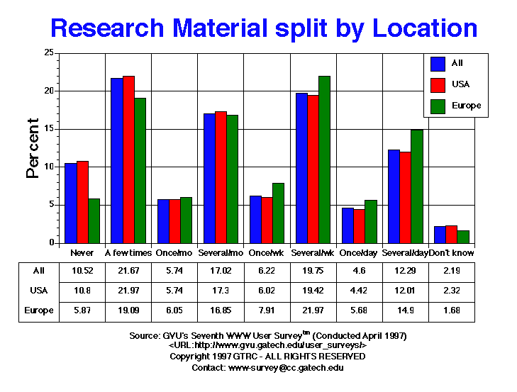 - The use of the Web to access research material seems to be increasing. 42.86% (39.16% Sixth) of the users reported using research material at least weekly. A fifth of the respondents (21.67% Seventh vs. 22.5% Sixth) reported using research information "a few times", with only 10.52% (12.79% Sixth) reported having never used online research information via the WWW. European respondents reported more frequent use of research information.