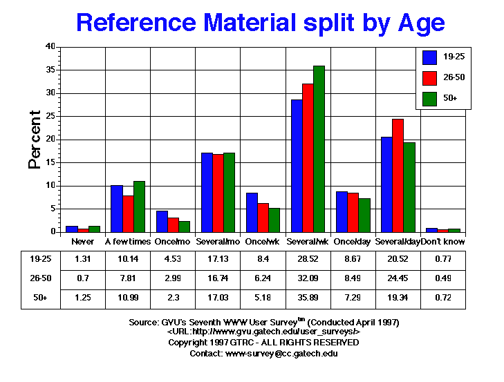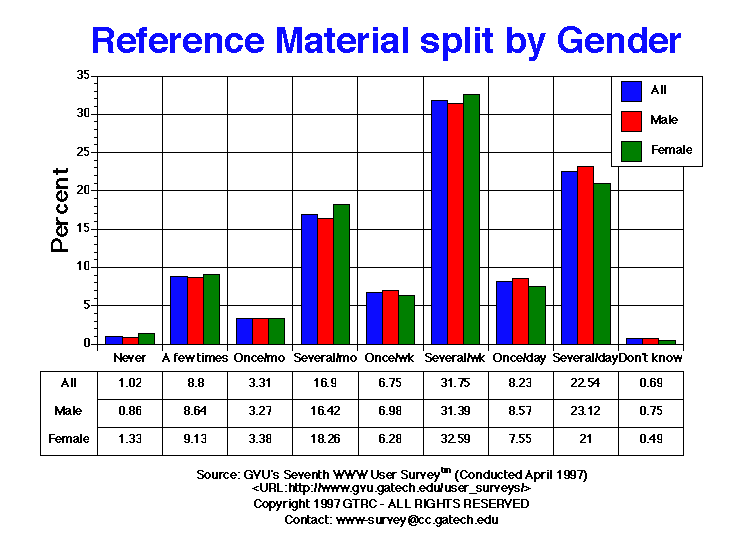 - Reference information continues to be the most frequently accessed category of those we inquired about, and people are using the Web more frequently than ever to access reference material. Nearly a third of the users (30.77% Seventh vs. 26.93% Sixth) of respondents reported using reference information on a daily basis and 38.50% (39.71% Sixth) use it on a weekly basis. Only 1.02% of the respondents have never accessed reference information on the Web! It seems reasonable that part of the reason for the increase in the number of hours people use the Web is reflected in the increased utility as measured by accessing reference material. Note that this is an area that is highly dependent upon useful content, much of which is has seriously started to emerge. The world of information has essentially become one's bookshelf (well almost). There is little difference across gender in the use of reference material.