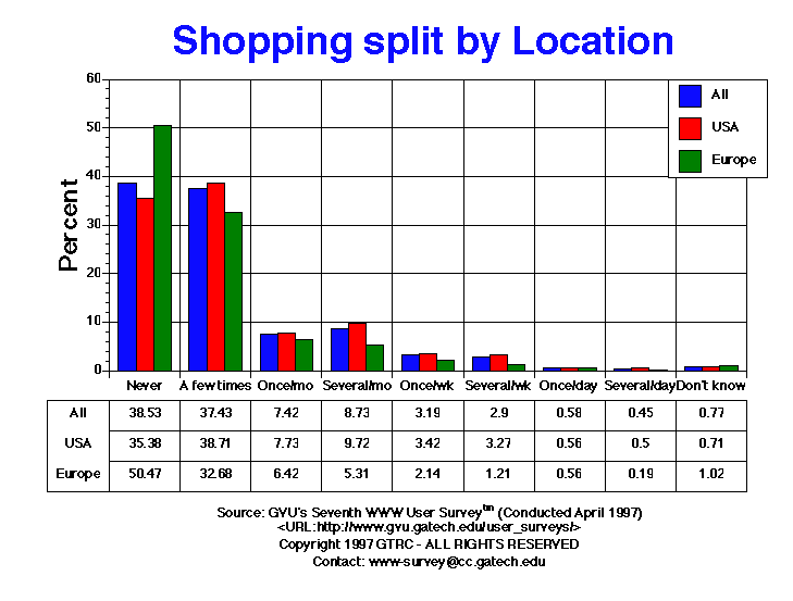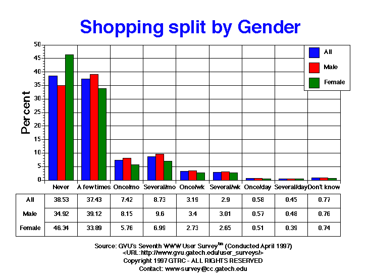 - For this question, shopping refers to actually making purchases over the Web. Over half of the Web users report having shopped on the Web at least once (61.47% of all users, 64.62% US and 50.47% European). A high percentage of users though (38.53%) still have never used the Web for online shopping, though this is lower than the Sixth Survey (41.16%) and the Fifth Survey (46.4%). Over a third of the users report having used it for shopping a few times (37.43 Seventh vs. 36.64% Sixth). There is almost no daily use (1.03%), but strong month use (16.15%). As seen in the Sixth Survey, males are more likely to have used the Web for shopping than females. Also, baby boomers (26 - 50 yr. olds) are more likely to use the Web for shopping than the older and younger generations.
