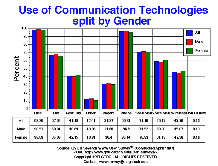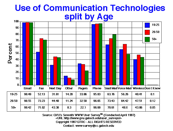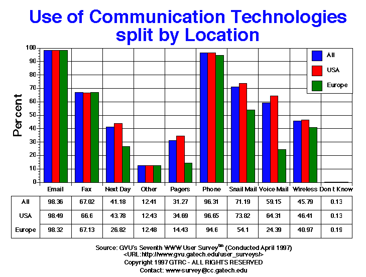 - With the purpose of gaining a better understanding of how Web users utilize other communications technologies, we asked users to report their use of these other technologies. As with the Sixth Survey, just about all (98.36% Seventh vs. 98.21%Sixth) of Web users have and use email. This is the roughly the same utilization as the phone (96.31% Seventh vs. 97.24% Sixth), which demonstrates an amazing acceptance/internalization of this new communications medium by the user community. Even more startling is that only three out of four people (71.19%) report using traditional mail (read: email has surpassed the use of traditional postal mail amongst Web users!). Email is truly the killer application of the 90's and the Internet. It is interesting to note that these percentages are nearly exactly the same as reported Sixth and Fifth Surveys.