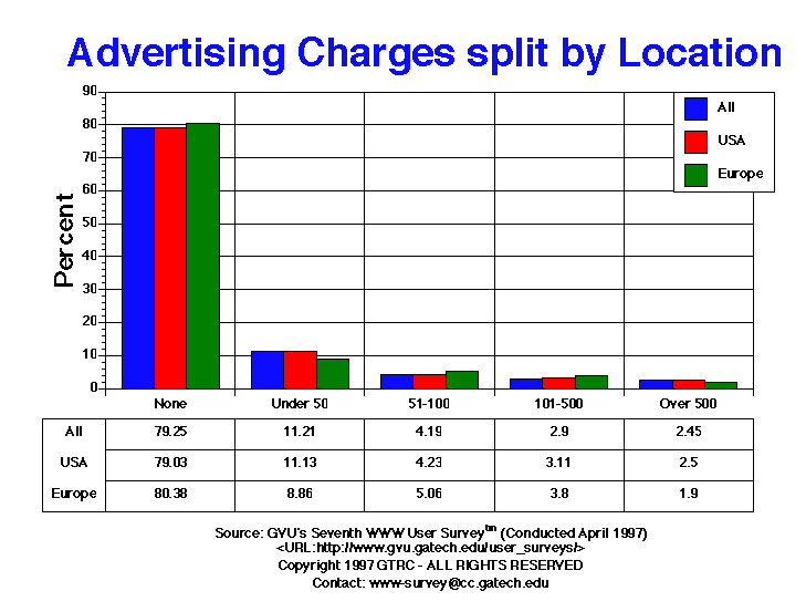 - More Webmasters report not providing advertising on their site (79.25%) than in the Sixth Survey (75.5%). Also, slightly fewer report charging more than $100/week (5.35% Seventh vs. 6.8% Sixth). While this may not seem like a large number of sites, it is more than a 500% increase when compared to the Third years, where only 1% charged this much for advertising.
