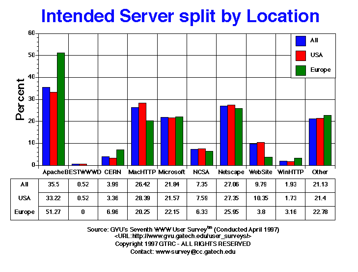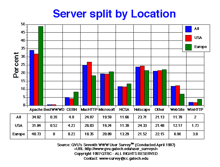 - The server used most by the respondents is Apache (34.02%), followed by WebSite/MacHTTP (24.87%), Netscape (23.71%), Other (21.13%), and Microsoft (19.59. This distribution does not mirror other surveys of Web servers, in particular Netcraft's Survey of HTTP Server. Netcraft's survey asks its database of over 750,000 servers what software it is running. Their May 1997 recent results place Apache with 42.36%, Microsoft with 16.31%, and Netscape with 12.14%. There are several reasons why our survey differs from theirs. The most important reason has to do with the non-random sampling and self-selection issues explained in the Seventh Survey discussion of methodology. However, Netcraft's methodology has their own set of troubles, like detecting virtual hosting and load balancing.