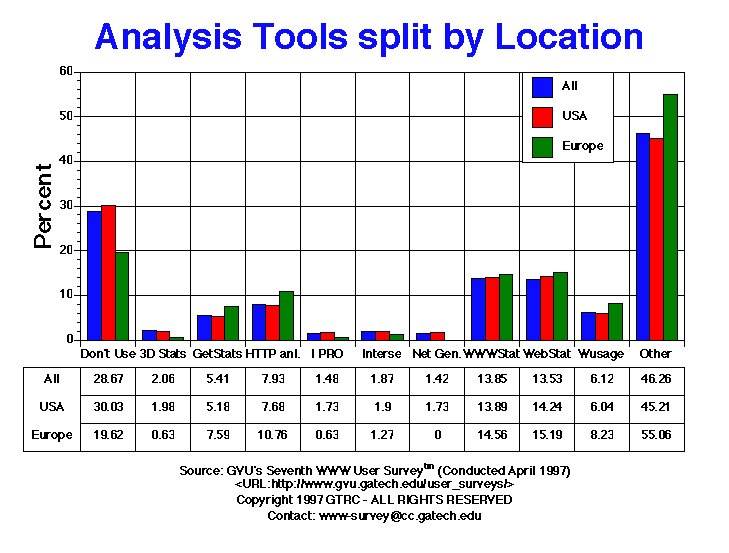 - This was a new question to the Sixth Survey. As with the Sixth Survey, most Webmasters reported using a log file analysis package not listed as one of our options (46.26% Seventh vs. 42.94% Sixth), while 28.67% (27.49% Sixth) reporting that they do not use any packages at all. For those Webmasters that do use a package listed, WebStat (13.85%) and WWWstat (13.53) are the most popular. Relatively few users reported using Net.genesis (1.42%), Interse (1.87%), or I/PRO (1.48%). It is our suspicion that many Webmasters write their own custom log file analysis tools.
