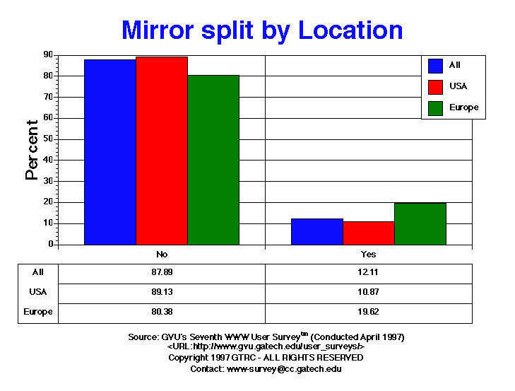 - The majority of sites do not operate mirrors (87.89% Seventh vs. 85.55% Sixth. This is a very stable characteristic with little growth over the years. In the Third Survey (April 1995) only a small percentage of users mirrored sites (8.55%) then as well (12.11% Seventh). European Webmasters are more likely to operate mirrors (19.62%).