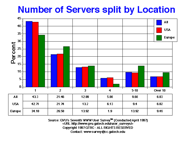 - Consistent with the findings of the Sixth Survey, the majority of Webmaster's report operating one server (43.30% Seventh vs. 43.36% Sixth), with 21.46% (23.42% Sixth) operating two servers, 12.89% (13.12% Sixth) operating three servers, and 6.83% (6.56% Sixth) operating more than then servers (a 2% increase over the Fifth Survey). European Webmasters are more likely to operate more servers than US Webmasters.