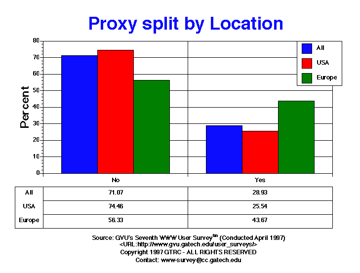- Close to a third (28.93%) of the Webmasters report operating a proxy. The proportion of Webmasters operating proxies continues to grow. (26.08% Sixth vs. 20.0% Fifth vs. 16.70% Fourth). This is especially true for European Webmasters, where 43.67% now operate a proxy compared to 33.60% one year ago in the Fifth Survey.