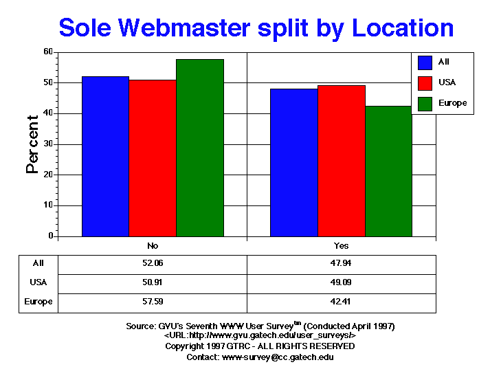 - This was a new question to the Sixth Survey. Just under half of the Webmasters share the position with other Webmasters (47.94% Seventh vs. 51.91% Sixth). Europeans are about as likely to share the responsibility of Webmaster (49.09.74%) than US Webmasters (50.91%).