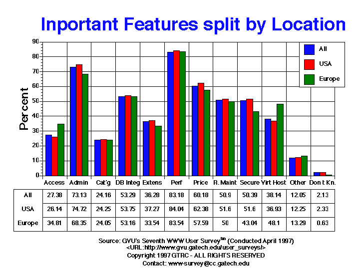 - Respondents were allowed to mark more than one answer. As with the Sixth Survey, the most important feature in selecting a Web server is performance (83.18% Seventh vs. 80.73% Sixth), followed by ease of administration (73.13% Seventh vs. 72.67% Sixth), price (60.18% Seventh vs. 56.56% Sixth), database integration (53.29% Seventh vs. 53.16% Sixth), remote maintenance capabilities (50.90% Seventh vs. 45.35% Sixth) and secure communications (50.39% Seventh vs. 47.51% Sixth). Virtual hosting increased in importance from being ranked 9th at 28.66% in the Fifth Survey to 7th at 34.34% in the Sixth Survey to 7th at 38.14% in the Seventh Survey. European Webmasters are more concerned about virtual hosting than US Webmasters (48.10% Europe vs. 36.93% US).