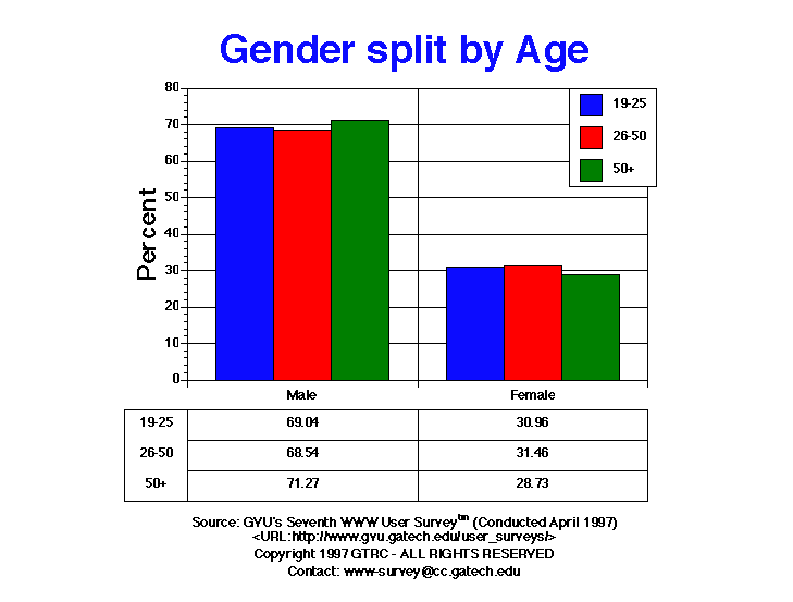 - The proportion of female users in the US has always been an interesting statistic to the popular media. Some research firms report the proportion of female users to be in the 40% range, while others (such as our Surveys and FIND/SVP's 1997 American Internet User Survey) report the proportion to be in the low to mid 30% range (GVU 7: 33.41% vs. FIND/SVP: 35.9%). Much of the difference between results can be explained by inspecting the definition of a user and possible age limitations placed upon the users. Our numbers, by the very nature of our sampling method, represent active Web users, whereas other numbers may more accurately reflect very casual users (i.e., they have used the Internet at least once in the past 6 months, etc.). Thus, neither number is necessarily wrong or better than the other in our opinion. We do recommend using a variety of research sources when making decisions based upon demographics.
