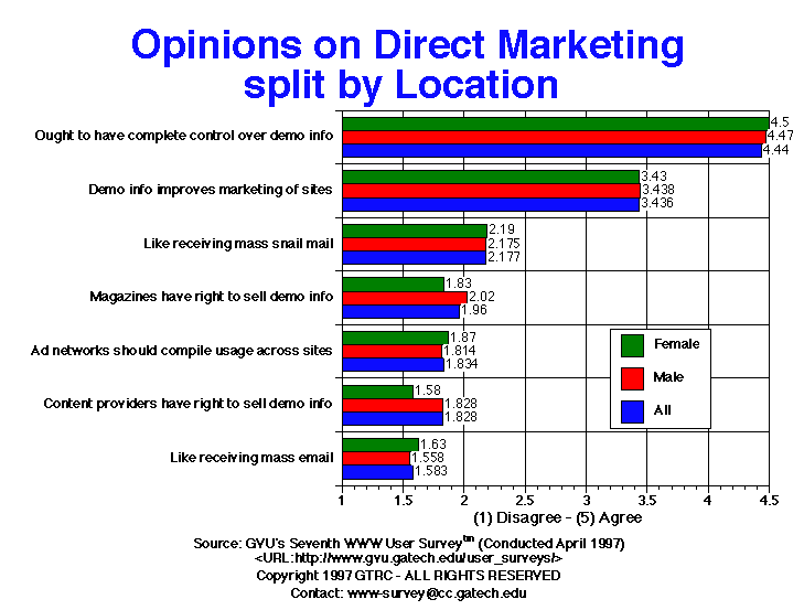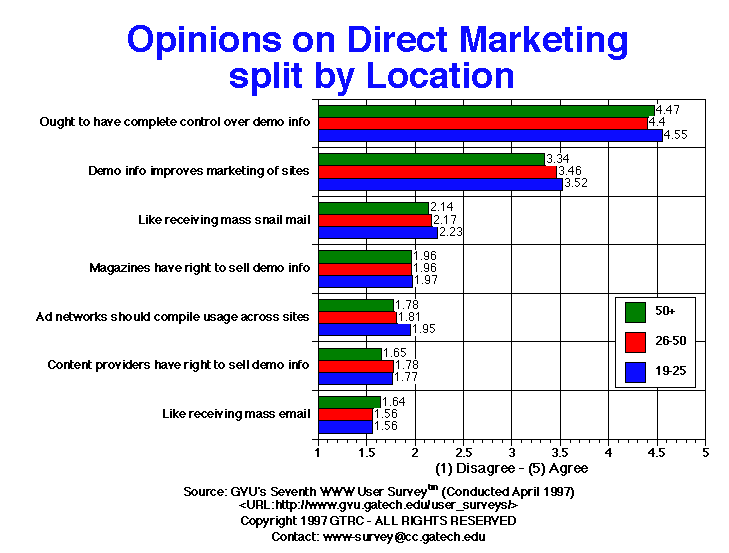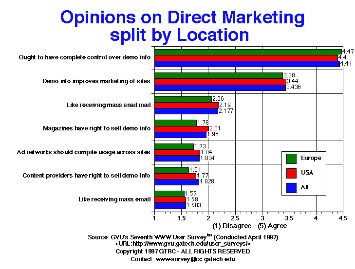 - The revealing of demographic information and the subsequent use of the information for direct marketing is currently a hot issue on the Web and one that will remain so for a while it seems. There is very little deviation of response by people on the issue of who ought to have complete control over their demographic information -- most strongly agreed that they ought to control their demographic information (4.44 Scale: 1 disagree 3 neutral 5 agree). This characteristic is unchanged from the Sixth Survey (4.43). Less agreement was found for the statement that the collection of demographic information helps improve the marketing of WWW sites (3.44 Seventh vs. 3.46 Sixth).