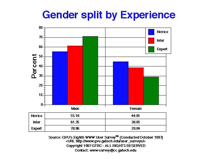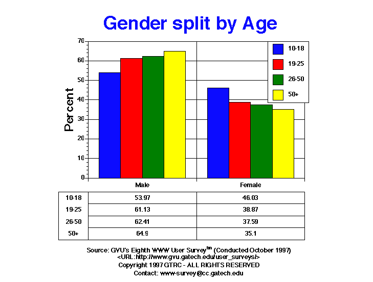 - The gender vs. age graph shows the percentage of male respondents increasing with age, while the percentage of female respondents decreases with age. Similar slopes are found on the gender vs. experience graph. The percentage of male respondents increases with experience, while the percentage of female respondents decreases with experience.