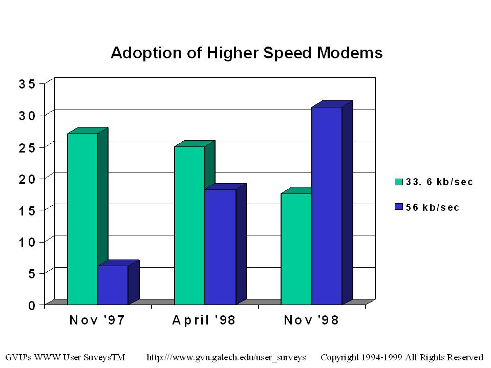 Inspection of the changes in modem usage across surveys reveals the quick adoption of 28.8 Kb/sec in late 1996 and early 1997, followed by the adoption of 33.3 Kb/sec in 1997, and 56.6 Kb/sec modems in early 1998. Since 56.6kbs modem were introduced their use has been incresing steadily. Percentage of users using 56.6 kb/sec modems is much higher in US(34.4%) than the percentage of users in Europe(13.3%). Surprisingly, among the age groups, 42.2% of the users who use 56.6kb/sec are more than 50 years in age. It can be inferred from the data that users quickly adopt the fastest modems as soon as they can acquire them.
