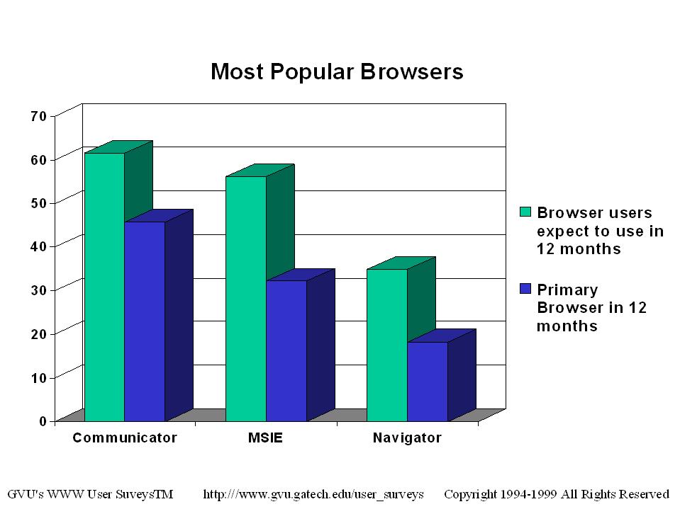 As initially reported in the last survey, the impact of browser bundling especially at the Web Service Provider (ISP) level has significantly changed browser market share. When asked about the browser which they expect to use in 12 months, 61.6% opted for Communicator. Communicator was followed by MSIE(56.2%) and then by Navigator(34.9%). The results clearly point out that Communicator is ahead of other browsers. 45.8% said that Communicator will be there primary browser in 12months as compared to 32.2% for MSIE and 18.2% for Navigator. Browser features were the most important factor affecting choice (16.2%) followed by ease of use and experience with vendors( both at 14%). The importance of features varies across gender, 48% of male users chose a particular browser for features as compared to only 32% among female users. A similar trend can be seen among different age groups (64% of the users falling in 10-20 years category chose a browser because of particular features as compared to 32% users who fall in above 50 year age group) and also among users with different skill levels (52% among expert users as compared to 15% among novice users). The percentage of people who obtained browsers for free varied across gender( Male users-70% and female users-50%). There seems to be a lot of satisfaction among users, 63.4% of them said that they never switched browsers.