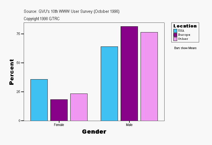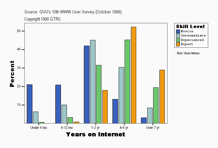 There was some backsliding in the percentage of female respondents to the 10th Survey (33.6%) when compared to the previous two surveys (38.7% Ninth, 38.5% Eighth). The current percentage is comparable to the levels of the Seventh survey, which was conducted a year and a half-ago (33.4%). More research will be needed to verify whether this represents the beginning of an actual trend, or whether it is an artifact of our sampling method. Interestingly, Europe showed an increased percentage of female respondents--18.4%, up from 16.3% in the Ninth survey six months ago. Regardless of geographic location, new users (those who have been online for less than a year) are still quite gender-balanced with 48.5% being female and 51.5% being male. There is also a new categorization of respondents used in this survey--by skill levels. (See Skill Levels for an explanation). Those who were novices were nearly equally divided between male and female.