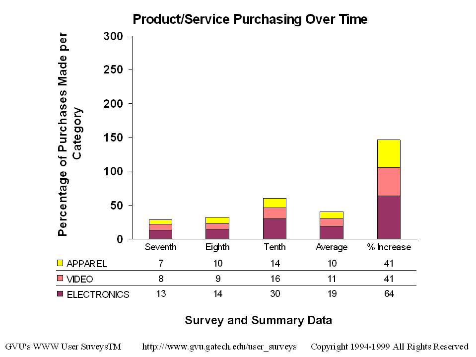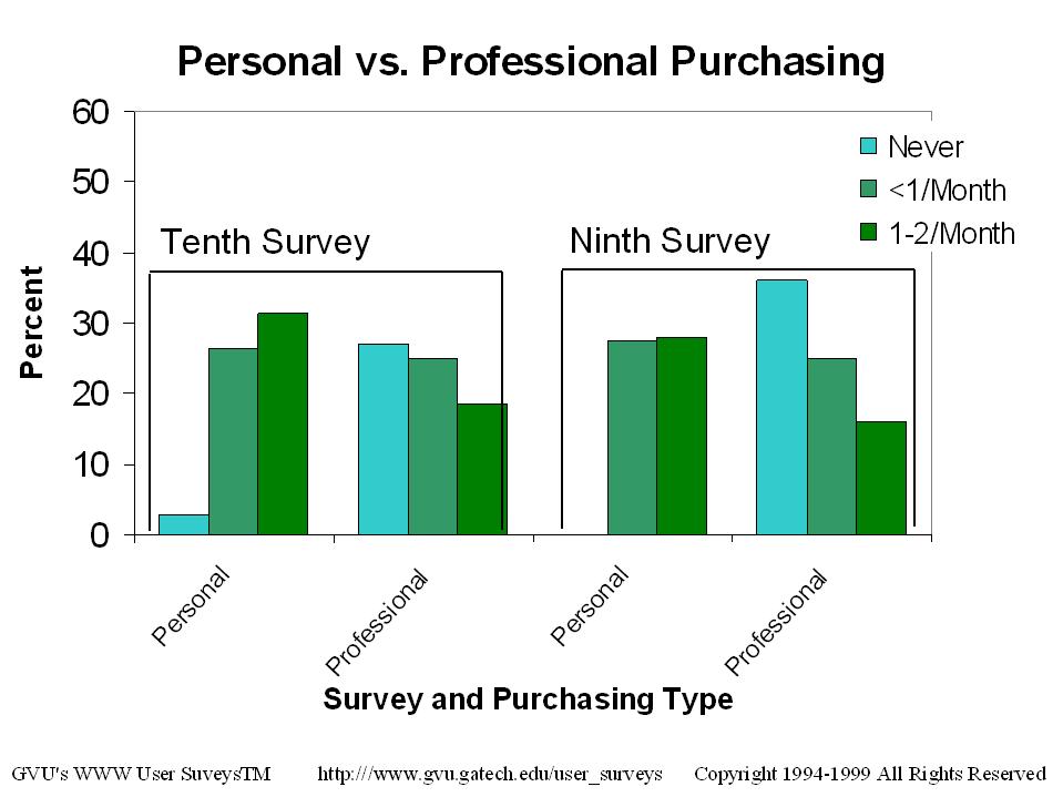 The tenth survey also confirms the increased use of the Web for transactions. Both reports of personal and professional shopping are up by significant percentages (10.3% and 23.7%, respectively) since the ninth survey. The product/service categories seeing the majority of this growth have been apparel, video and electronics. Interestingly, contrary to popular belief about the importance of security to customers using the web for shopping, our survey showed that, overall, quality information (10% of responses), easy ordering (9.7%) and reliability (9.6%) were important to more respondents than security (9.3%). There is plenty of work to be done by businesses to enhance their chances of getting shoppers to use their sites!