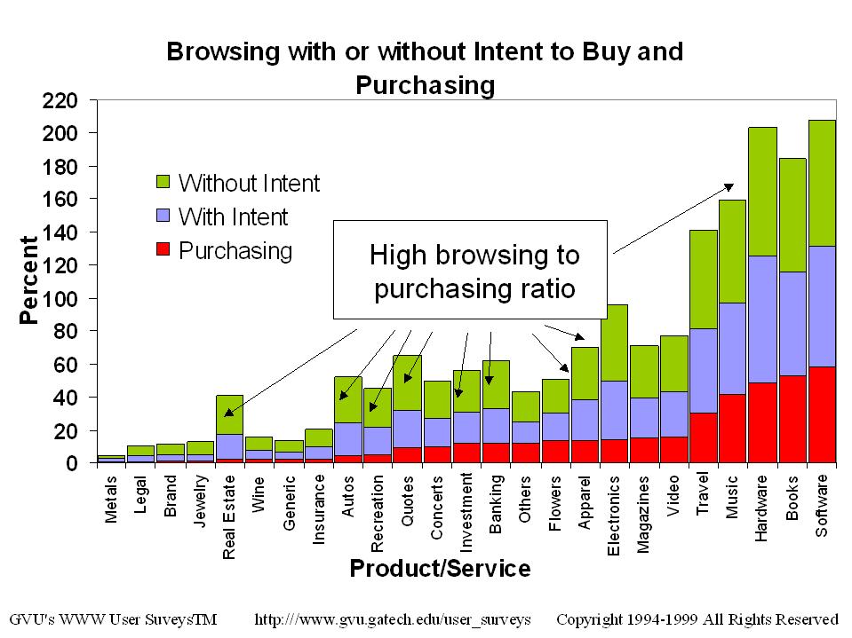 Software (58%), hardware (48.5%), books (52.6%), music (41.4%), travel (30.2%), electronics (30.2%), video (15.8%), magazines (14.9%), flowers (13.3%), apparel (13.6%), banking (12.1%).