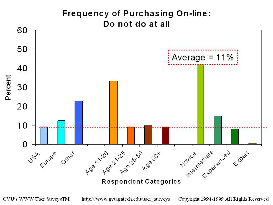 Why do individuals chose to use the web to purchase goods/services? Our survey showed that ‘convenience’ was a factor for 82% of individuals and was the most frequently cited of all reasons for using the web (21% of reasons given). Of 8 other factors included in the questionnaire as possible responses, saving time, the presence of vendor information and the absence of sales pressure were the most frequently cited as reasons for using the web (18.8%, 18.7% and 16% respectively). This pattern of response was repeated across categories with two notable exceptions. Of respondents located in neither the USA nor Europe, 80.8% cited vendor information in as a factor and ‘Novices’ cited convenience and absence of sales pressure equally (in 62.5% of cases).