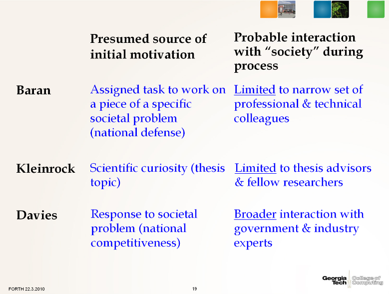 Kleinrock took a more direct, science-driven approach, but once he developed much of the needed theory, became directly involved in the engineering development. Nonetheless, at that point in time the work was largely an engineering project with its own dynamics independent of external society. Davies, on the other hand, was rather directly involved with society (in the form of government) not only from the start but pretty directly as he developed and tried to expand an early network.