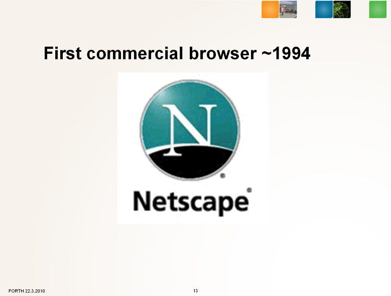 In 1990, the first version of the World Wide Web was put into use at CERN to provide physicists and other researchers with a better interface to information stored on computers that were connected to a network. This led to the development of the first successful graphical browser, Mosaic, for viewing documents. By the mid-90s the Web had started to spread, Mosaic had been transformed into a commercial version – Netscape – and the “dot com” boom was on.