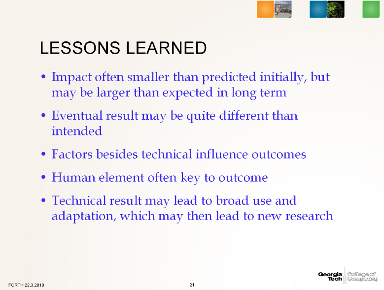 There are many more fascinating stories of how the current Internet came to be, but my time is almost up. My host, Constantine Stephanidis, said I needed to limit my talk to one hour. I tried to bargain for two hours time, but holding the lecture at six in the evening – just before food is served – has prevented that!