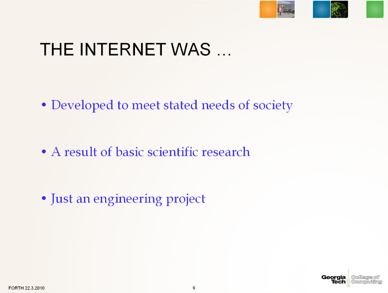 A corollary of this observation is that it is often hard to differentiate between science and technology in many situations. This is certainly true for computer science. Indeed, Stokes’ model is an oversimplification, with work undertaken in one quadrant often migrating to another. For simplicity, I will simply talk about “science” today, although a good bit of the Internet story is about technology and engineering in the usual sense.