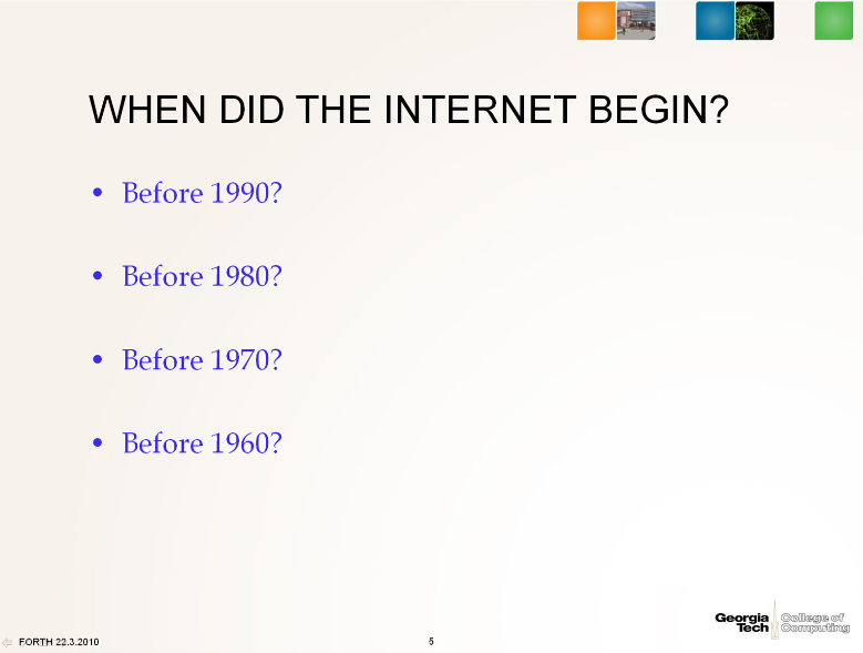 Before we begin the story of how the Internet came to be and where it may be headed, let me ask you a few questions – just answer by a show of hands – grades will not be given!