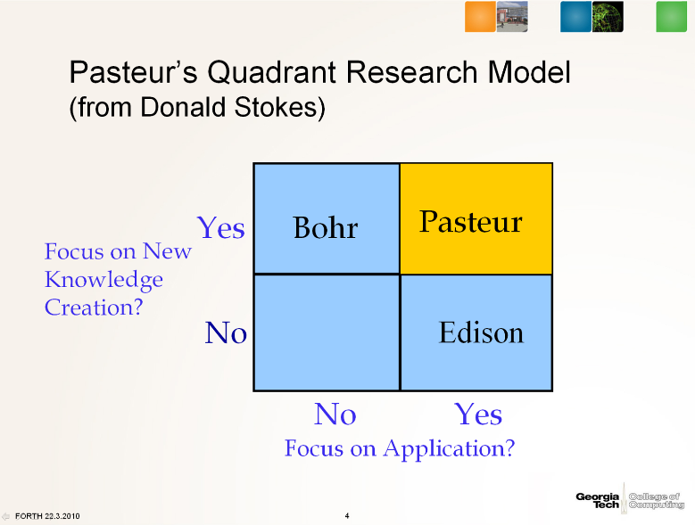 Stokes uses the great Danish theoretical physicist, Niels Bohr, as the exemplar of science for science’s sake – research that is driven internally by questions that arise from research. Astronomy, most of theoretical physics, much of mathematics, even parts of theoretical computer science fall into this quadrant.