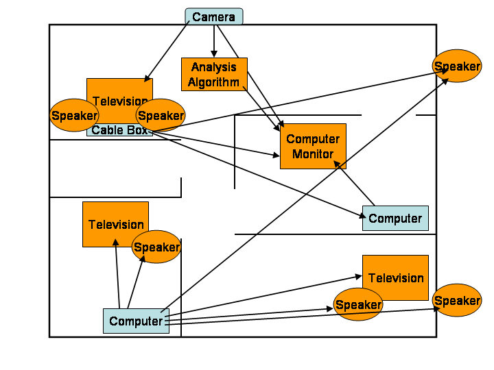 Figure 1, This figure demonstrates a simple distribution of multimedia sources in the home. Each source is directed to multiple media sinks for consumption. MediaBroker facilitates such distribution --of devices AND media. |