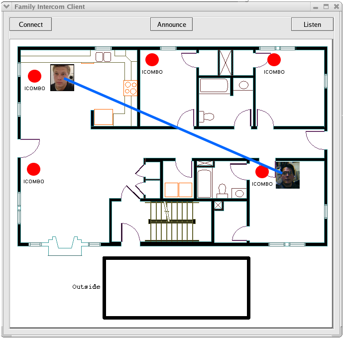 Figure 2, The current GUI for the Family Intercom allows simple visualization of where in the home users are. The users can then be connected via audio channels provided by nearby Microphone/ Speaker media nodes. |