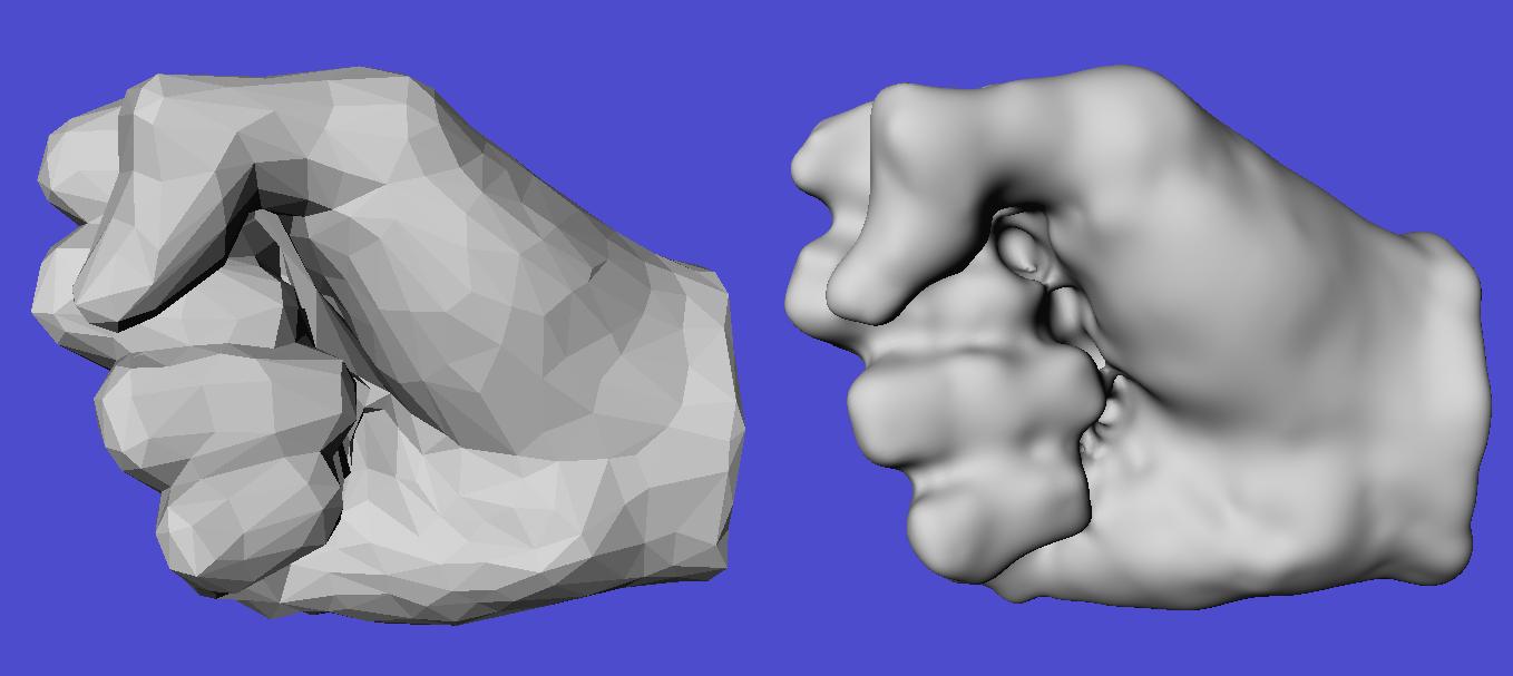 Polygonal fist (left) and resulting implicit surface (right).