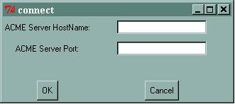 In the first text field, enter the host name of the machine on which the ACME Server is running. You may also enter the specific IP address for the server if desired. For instance, you might use 127.0.0.1 if you are using the VisEd and ACME Server on a stand-alone machine. On the internet, you might enter the fully qualified name such as mirth.cc.gatech.edu.