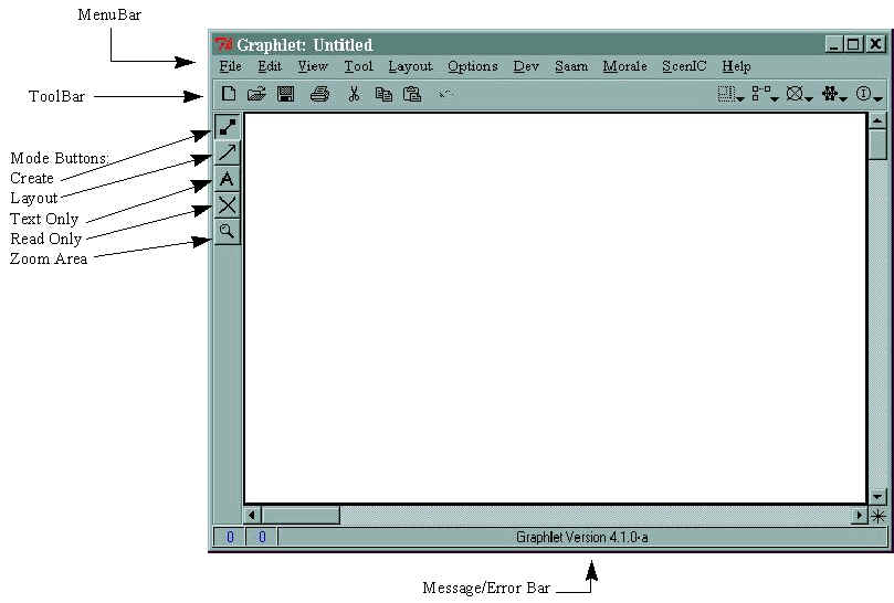 In Graphlet Mode, the Standard MenuBar Items: File, Edit, View, Tool, Layout, Options, Dev and Help are fully available. The MenuBar items Saam, Morale and ScenIC are specific to VisEd functionality.