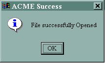 In the Graphlet install directory, there is an example ACME file from the ACME Lib distribution called "existing.acme". Click on the filename (exising) and then on Open. VisEd then transfers the local file to the server and asks the server to open it. ACME Server then uses the ACME Lib parser to parse and open the file. After this procedure you should see the success dialog: