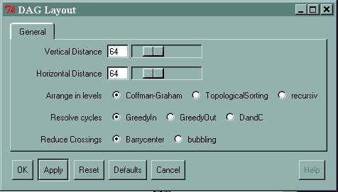 First lets look at user control of the layout algorithm parameters. Activate the Options pull-down menu by clicking on it in the menu bar. Now move the mouse pointer over Layout and you will see a list of user-controllable algorithms. Select DAG (Options->Layout->DAG). You will see the Layout modification window as below: