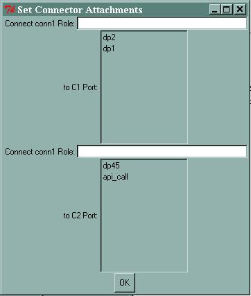 If the connector has an ACME type, the standard type roles will be shown in the role text boxes and you will need only specify the ports by clicking on them. In this case though, there was no connector type so we must manually specifiy the roles. First type put in the first text box, then click on dp2, then type get in the second text box and click on dp45. Finally, press the OK button.
