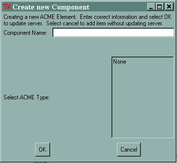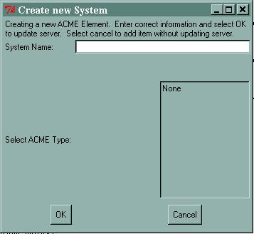 If there is no existing system and you are creating one from scratch, the first thing you must do after connecting to the server is to create a new top level system. This is accomplished by selecting the Morale->New ACME System... menubar selection item. This will activate the new system dialog where you may enter a name for the ACME Top Level System. In the first text box enter the name of the ACME system, and in the Type list box select the system type by clicking on it. For totally new ACME Systems, you will only have the choice of clicking on None. Then press OK to accept.