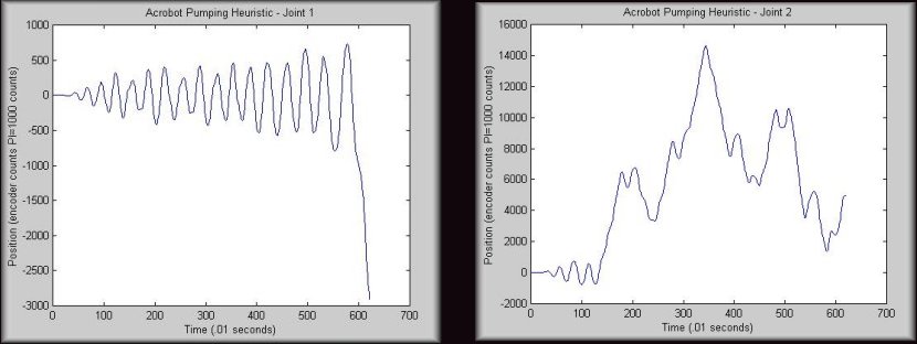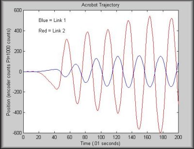 As you can see above, the acrobot never got close to being inverted. It would oscillate in a scissoring motion at about the same amplitude as shown above and never break out of this rhythm.