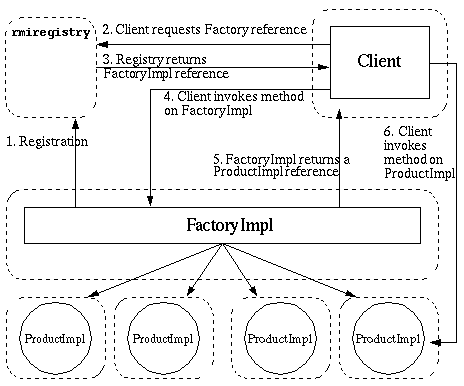 FactoryImplreturns a remote reference to an existingProductImplor to one that it just created, based on the client request- The client invokes a remote method on the