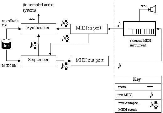 The diagram below illustrates the functional relationships between the major components in a possible MIDI configuration based on the Java Sound API. (As with audio, the Java Sound API permits a variety of MIDI software devices to be installed and interconnected. The system shown here is one potential scenario.) The flow of data between components is indicated by arrows. The data can be in a standard file format, or (as indicated by the key in the lower right corner of the diagram), it can be audio, raw MIDI bytes, or time-tagged MIDI messages.