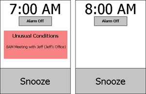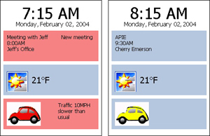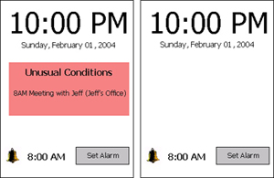 Our clock's interface helps users decide the night before when to get up and what to wear by displaying unusual events (left image=unusual, right image=usual). | |