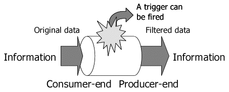 Figure 1 illustrates an infopipe that works as a filter or an event handler. You can see that the consumer-end of the infopipe captures information and the filtered information is generated at the producer-end. At the middle of the infopipe, it works as a filter or an event handler. Figure 2 illustrates an example of the Infopipe composition; with this, more complex functions can be implemented by using infopipes.
