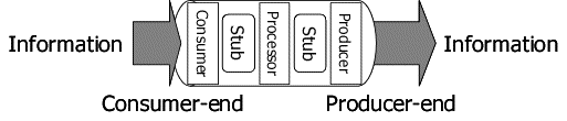 Figure 3 illustrates the Infopipe stub. A part of the captured information is somehow passed from the consumer-end to the processing middle and the result of it is passed to the producer-end to generate new information flow. Stub works at the both of between the consumer-end and the processing middle and between the processing middle and the producer-end.