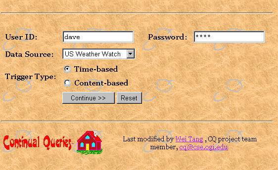 Users must log in to install a continual query. Logging in allows the system to identify the user and to inform the user of updates to the CQ. Without logging in, there is no way for the system to update the user when new information is available.