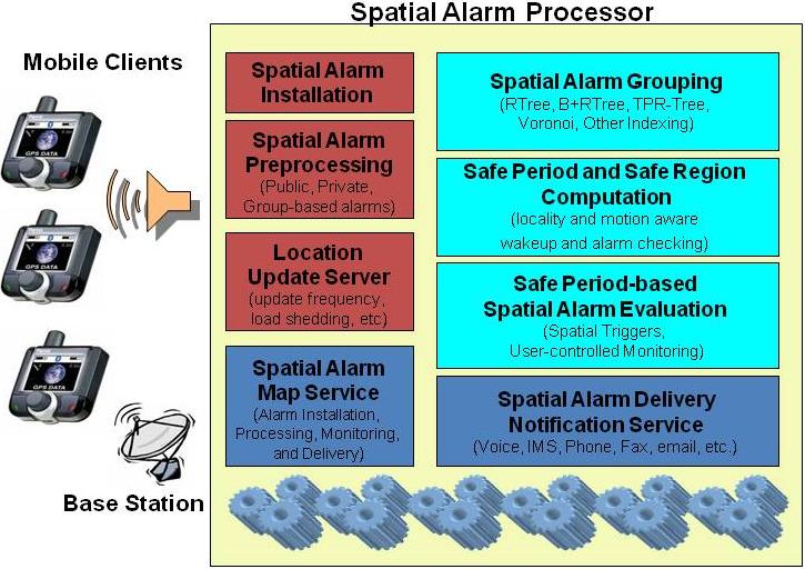 Most people use time-based alarms in their daily lives in order to wake up in the morning or to remind them of important time-based events. Such alarms are effective reminders of future events that have a definite time of occurrence associated with them. Just as time-based alarms are set to remind us of the arrival of a future reference time point, spatial alarms are set to remind us of the arrival of a spatial location of interest. Thus, spatial alarms can be modeled as location-based triggers which are fired whenever a mobile user enters the spatial region of the alarms. Spatial alarms provide critical capabilities for many location-based applications ranging from real time personal assistants, inventory tracking, to industrial safety warning systems.