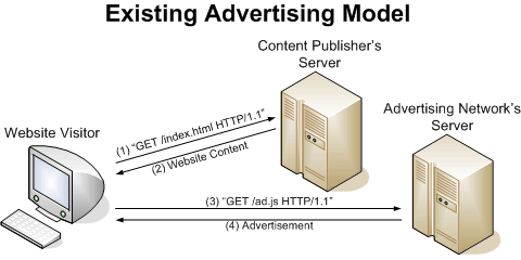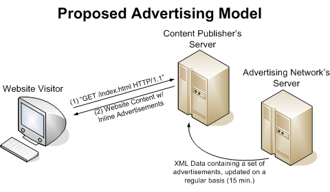 This project aims to implement a prototype for an advertising network, which works like a greedy algorithm. It will use the standard CPC pricing model, where advertisers select a bid price per click when placing an ad. However, rather than having the advertising network select ad placement, and excluding the content publishers from the selection process, the advertising network will deliver a collection of advertisements--along with their bid prices and other statistics--to a content publisher in a standard (XML) format. The content publisher's web server could then run software to select which ads to display to a user, and use server-side includes or scripting to integrate the ads into the web site's content. Thus, the ads no longer rely on JavaScript running on the visitor's web browser. The two figures below illustrate the difference between current advertising systems and the proposed system.