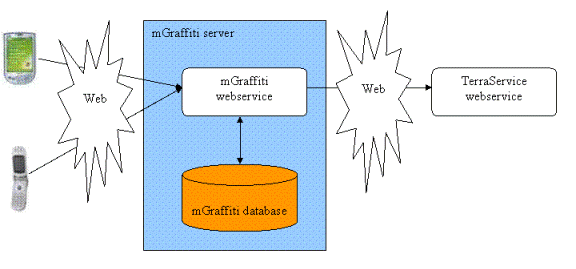 o The mGraffiti server retrieves satellite image tiles from the Microsoft TerraService XML web service when needed to serve the mobile clients.