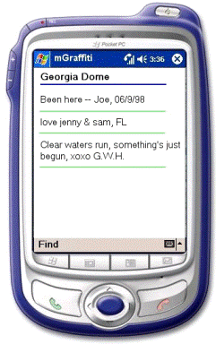 Jack taps on the Georgia Dome mGraffiti spot and views the messages scribed so far.