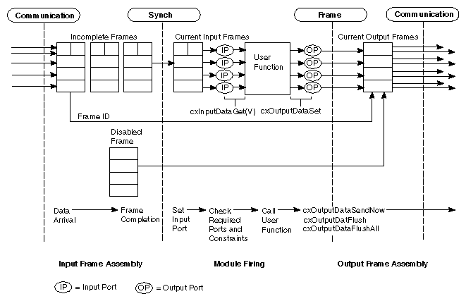 A disabled module handles new frames by merging them onto the input ports, then sending a NULL (synchronization) frame downstream; the user function is not called. When the module is enabled, if there is an unused partial frame merged into the input ports, then the user function is called.